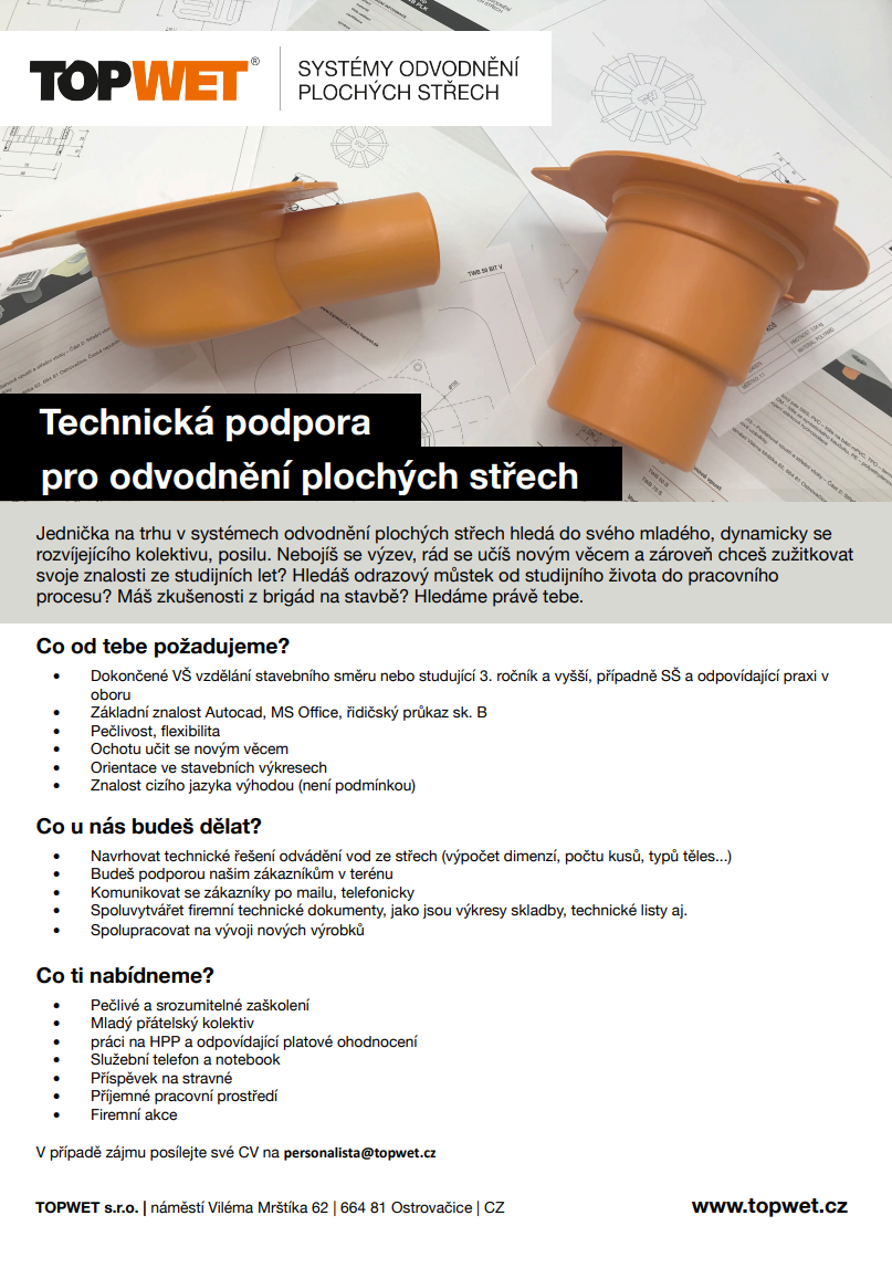 firma TOPWET s.r.o. přijme posilu na pozici Technické podpory pro odvodnění plochých střech.